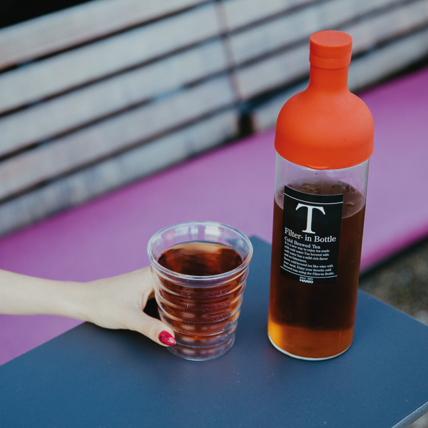 Viinipullon muotoinen Hario Cold Brew Pullo 75cl on loistava teen valmistamiseen. Täytä kylmällä vedellä ja teenlehdillä, laita jääkaappiin 3-6 tunniksi ja nauti herkullisesta cold brew teestäsi.