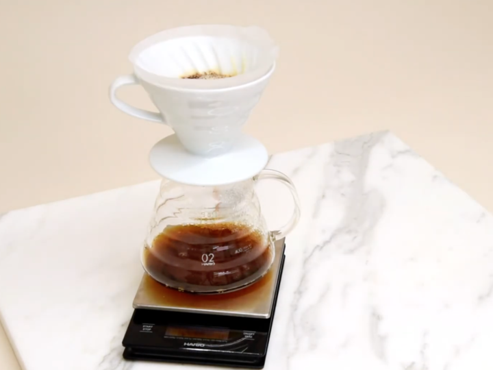 - Laita suodatinpaperi suodatinsuppiloon ja huuhtele suodatinpaperi pikaisesti lämpimällä juoksevalla vedella. Näin varmistat, ettei paperin makua pääse kahviin.