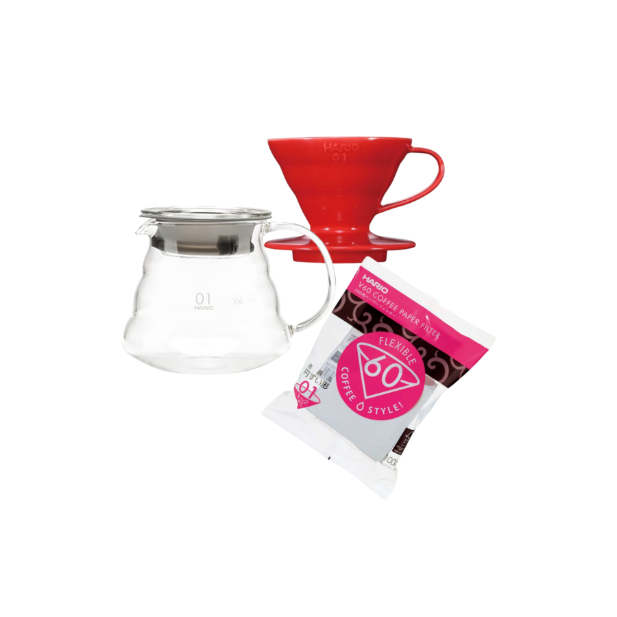 The product includes: Hario V60 size 01 red, Hario V60 Range server 01, Hario V60 filter paper 01