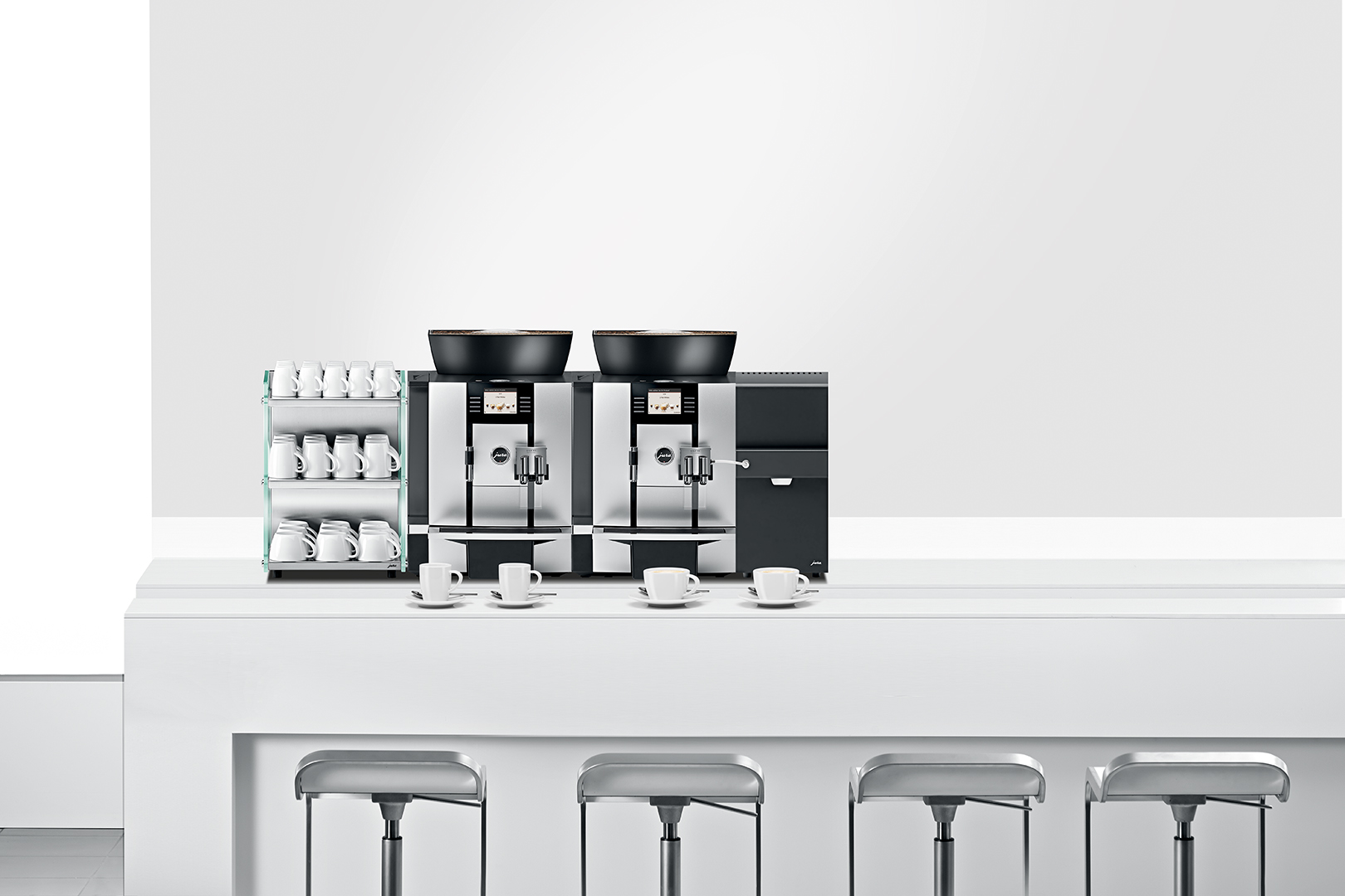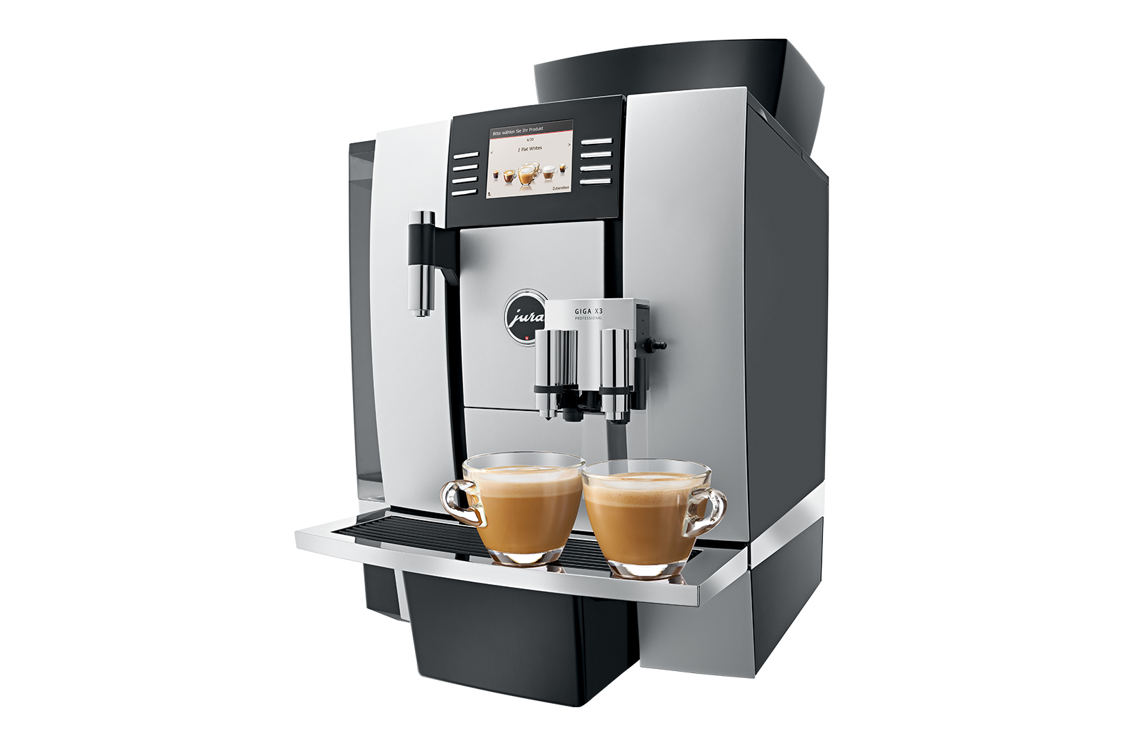 Jura GIGA x3 Professional coffee machine. The new GIGA X3 Professional offers everything needed by staff in a large office or break-out room. It delivers up to 31 individually programmable speciality coffees and another 12 barista recipes at the touch of a button, including the en-vogue flat white. As well as offering simple operation, it takes minimum effort to refill thanks to the large bean container with a holding capacity of 1 kg and aroma preservation cover. Other features include an optional coffee grounds disposal function and drip drain set.