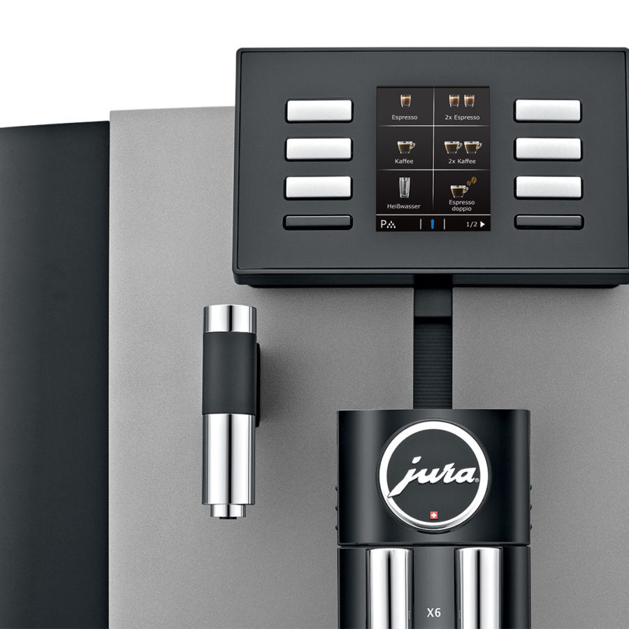 Jura X6 Dark Inox -kahviautomaatti. Tarvitsetpa sitten mustaa kahvia, kupillisen tai koko pannullisen, taikka eri teelaaduille sopivaa kuumaa vettä, X6 on ihanteellinen ratkaisu. Sen helposti ymmärrettävä toimintakonsepti on erityisen käyttökelpoinen silloin, kun sitä käytetään itsepalveluratkaisuun henkilökunnalle tai vieraille. X6-koneessa kaikki erikoiskahvit voidaan myös siirtää eri paikkaan näytöllä. Suuren vesisäiliönsä ja valinnaisen raikasvesisarjansa ansiosta X6 soveltuu aivan yhtä hyvin liikkuvaan käyttöön kuin käytettäväksi kiinteässä paikassa.