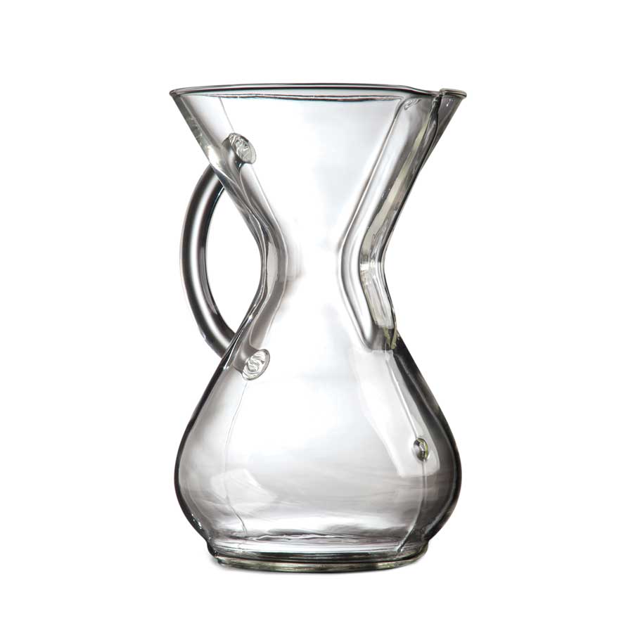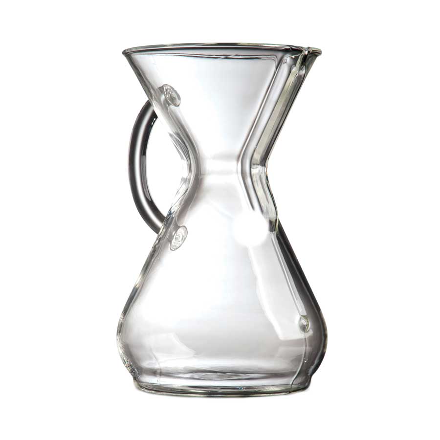 Chemex Classic kahvalla on sama klassinen tiimalasin muotoinen karahvi kuin perinteinen Chemex, mutta varustettuna tukevalla kahvalla.