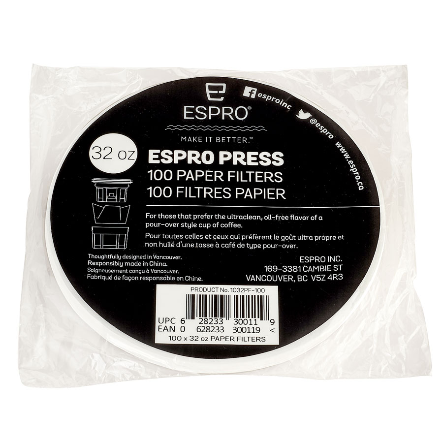 Espro Press suodatinpaperit 32oz soveltuvat Espro Press 32 oz -kokoisiin pressupannuihin (sopii 32 oz-kokoisiin P7, P5 sekä P3 -pannuihin). Paketissa on 100kpl suodatinpapereita.