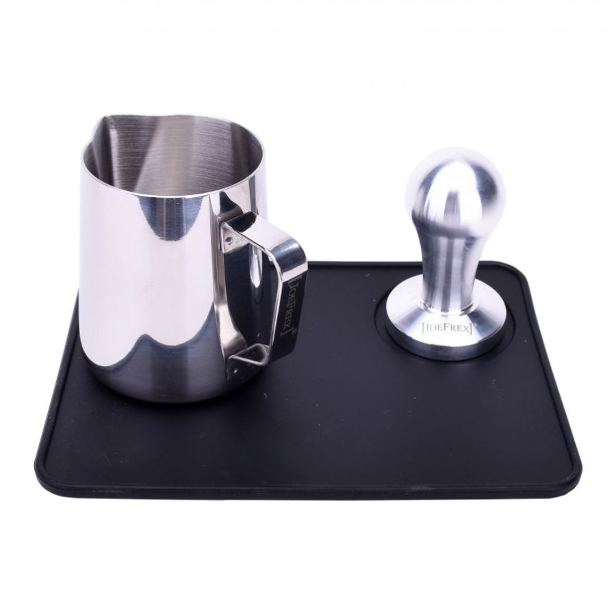 Tämä Joe Frexin S-kokoinen kiinteä silikoninen tamppausmatto varmistaa, että kahvinporot eivät liukene matolta ja työtasosi pysyy puhtaana.