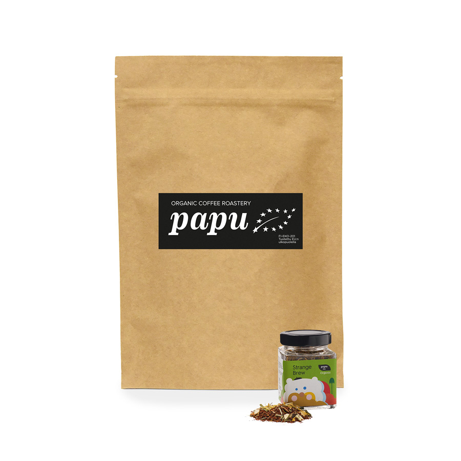 Strange Brew Luomu. Raikkaan sitruksinen ja hunajainen Rooibos sekoitus. Sisältää sitruunan kuorta, appelsiinin paloja, kehäkukan terälehtiä ja sitruunaruohoa. Kofeiiniton, ei sisällä tanniineja.