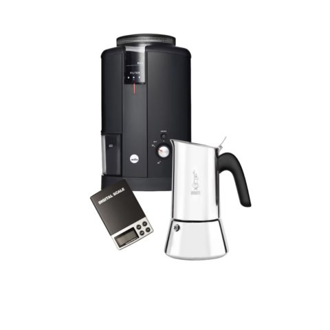 Ei vielä kommenttejaLue lisääSLURP italialainen tuotepaketti sisältää 4 kupin Bialetti Venus mokkapannun, Wilfan Svart Aroma kahvimyllyn ja digitaalisen